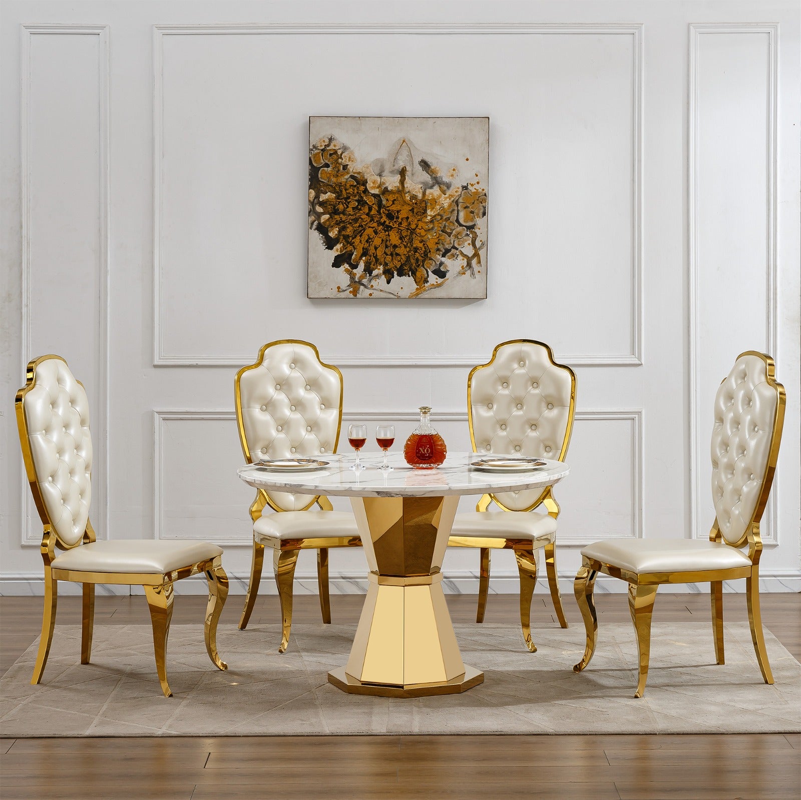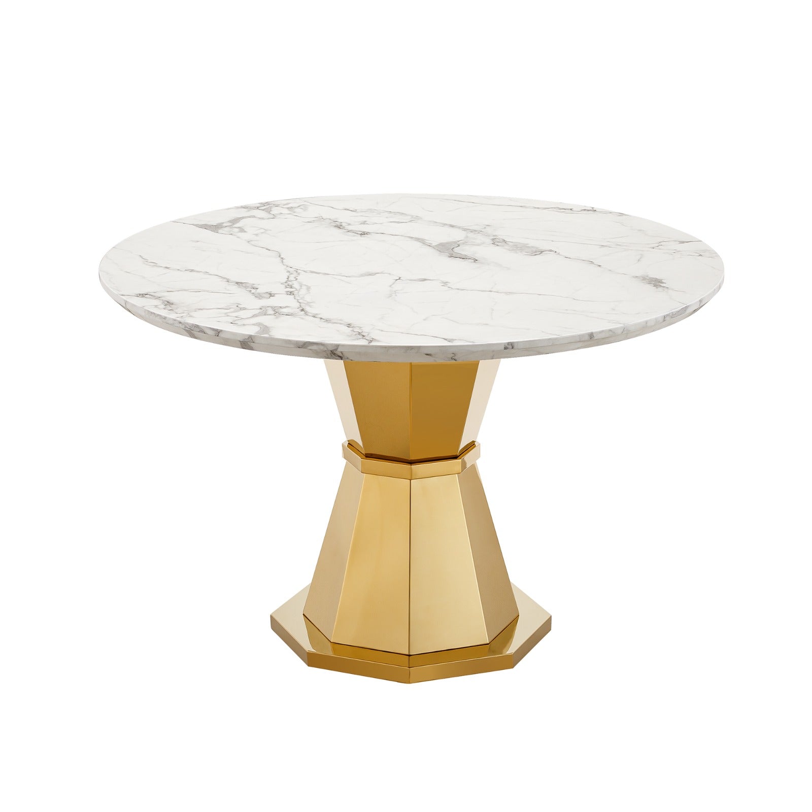 The tabletop features a refined marble effect finish that captures the beauty of natural stone while offering practical resistance to oil and stains. This ensures easy maintenance and long lasting visual appeal. Supporting the tabletop is a premium stainless steel pedestal base polished to an eight K mirror finish providing exceptional strength stability and long term structural integrity.