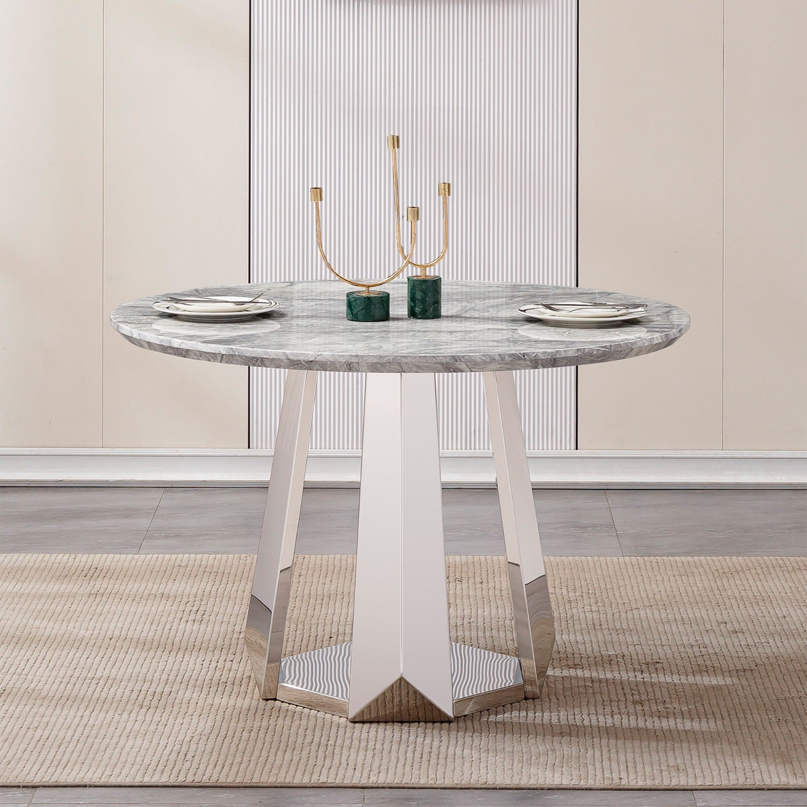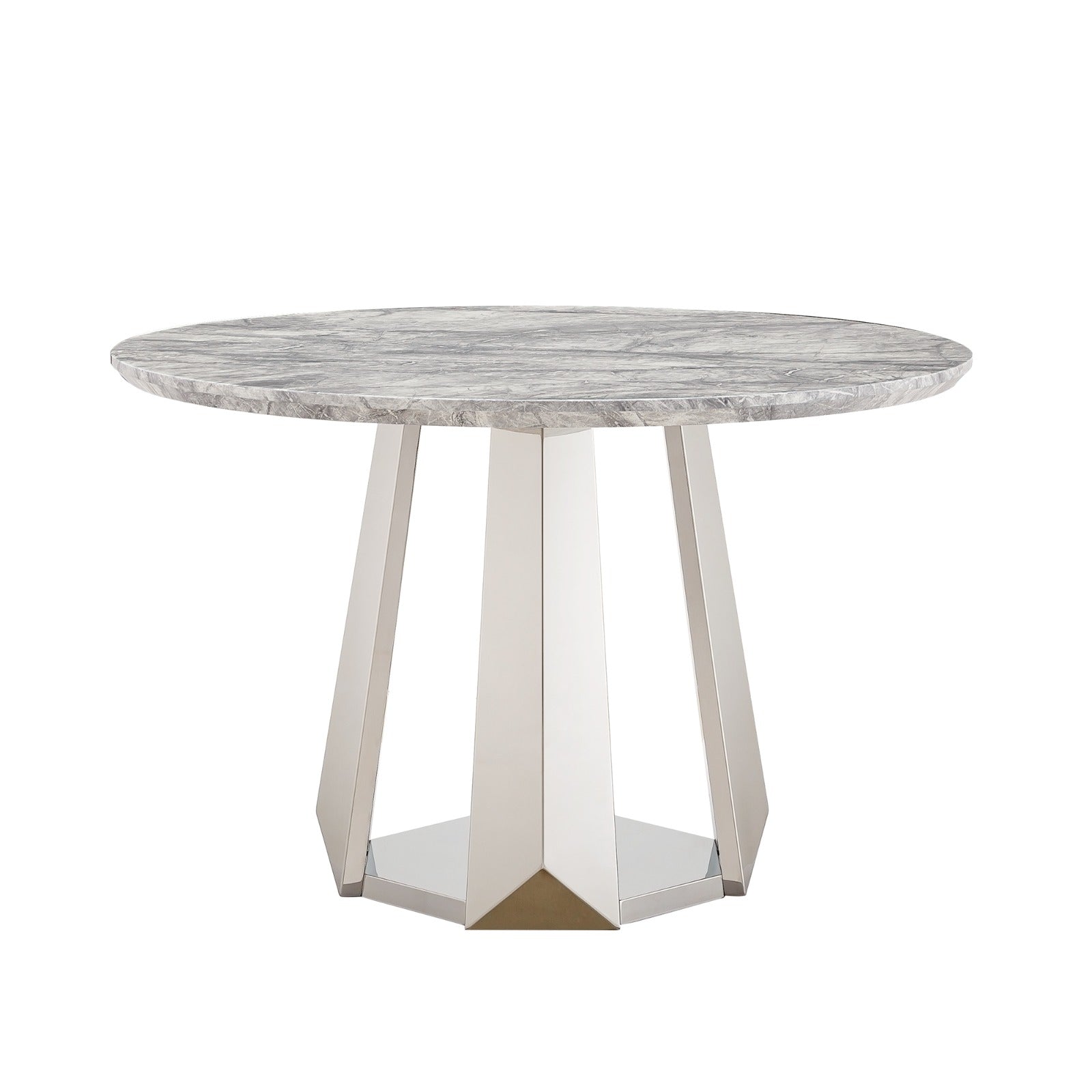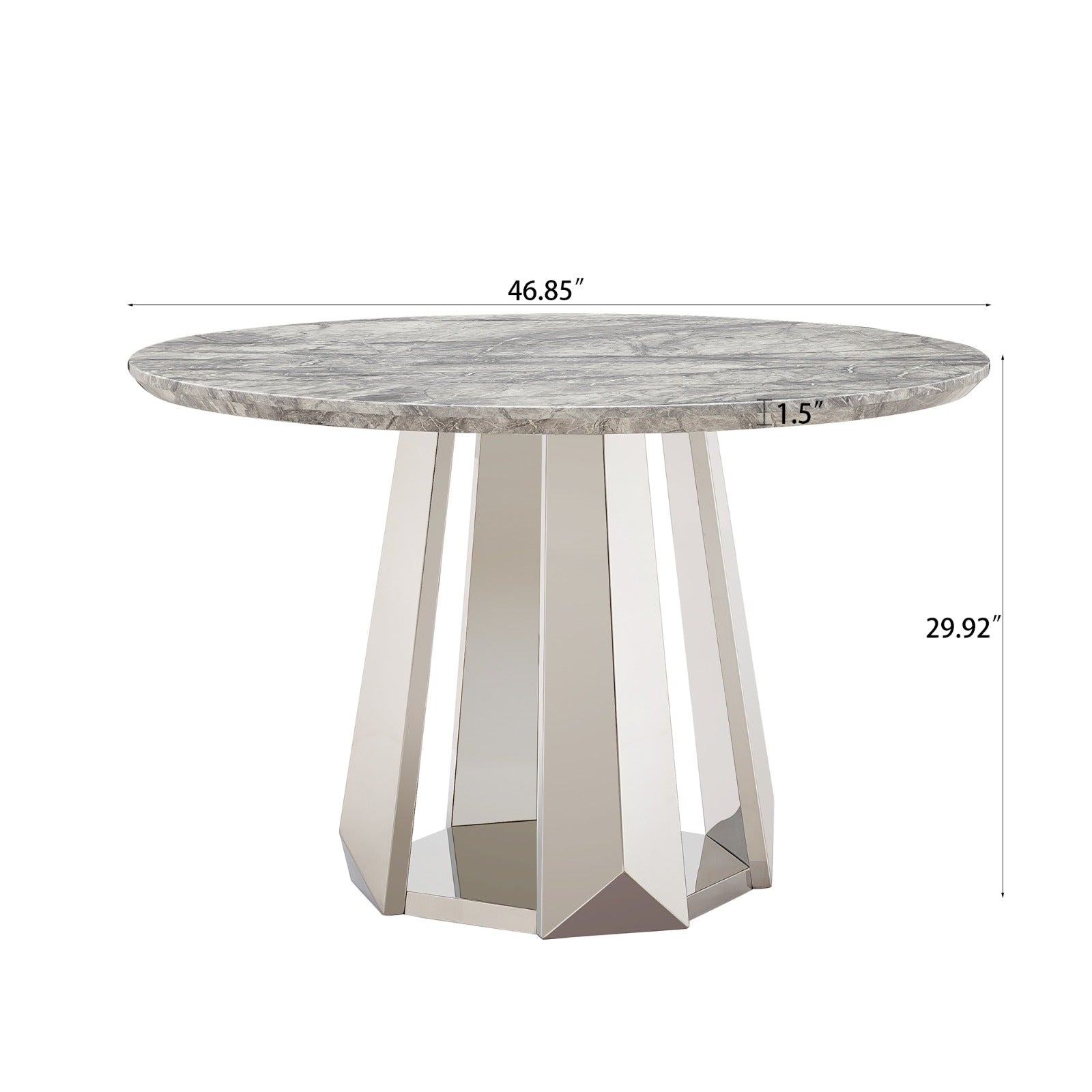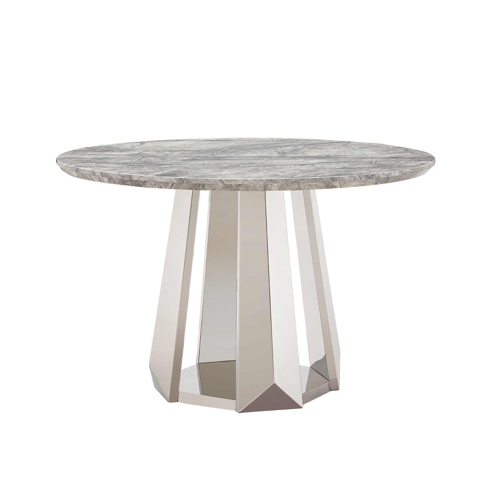 The tabletop is finished in an elegant marble effect surface that reflects the beauty of natural stone while offering excellent resistance to oil and stains. This ensures effortless maintenance and long lasting visual appeal. Supporting the tabletop is a premium stainless steel base polished to a high gloss mirror finish providing exceptional strength stability and durability for consistent daily use.